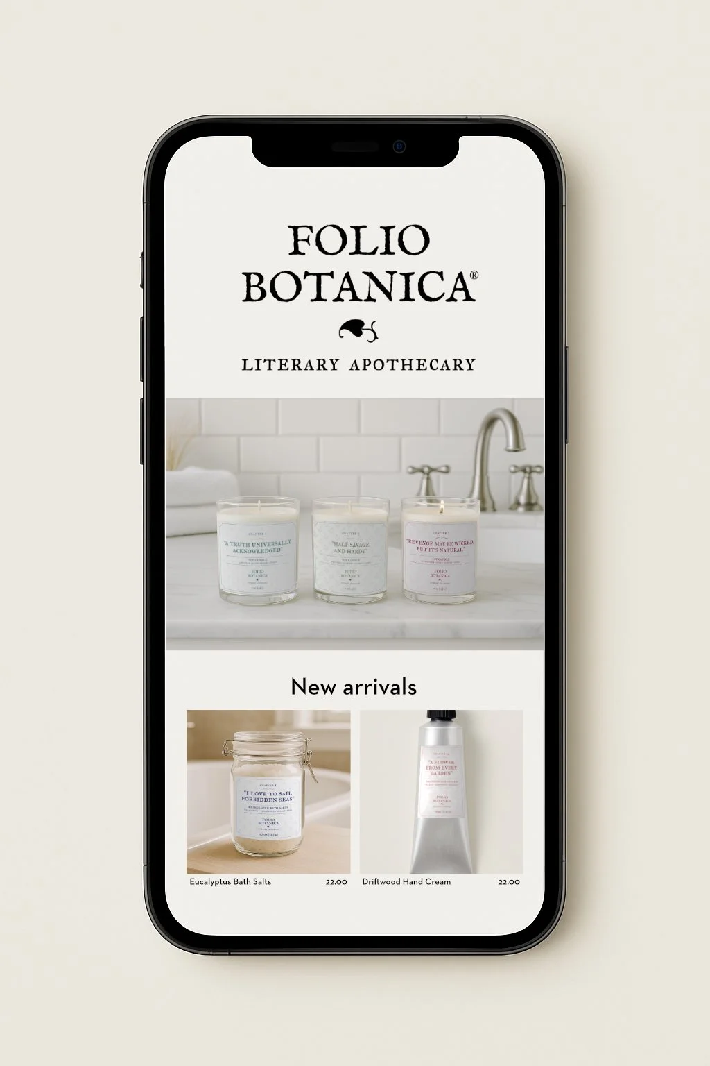 Folio Botanica turns classic literature into scent, treating each product like a chapter. The identity is understated and bookish—small caps, a restrained palette, and a ❧ fleuron—so the labels feel timeless while the packaging stays fresh and giftable.