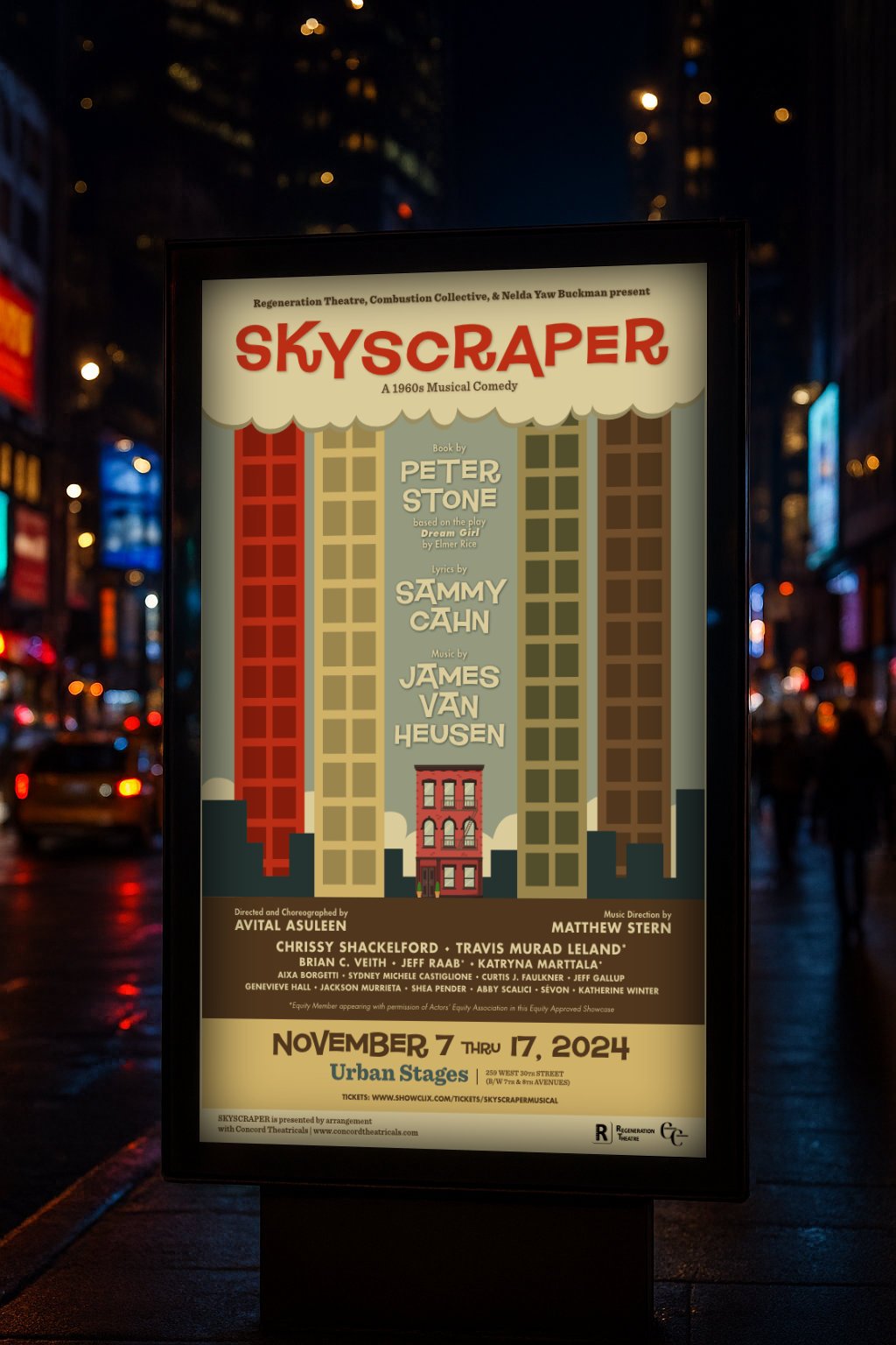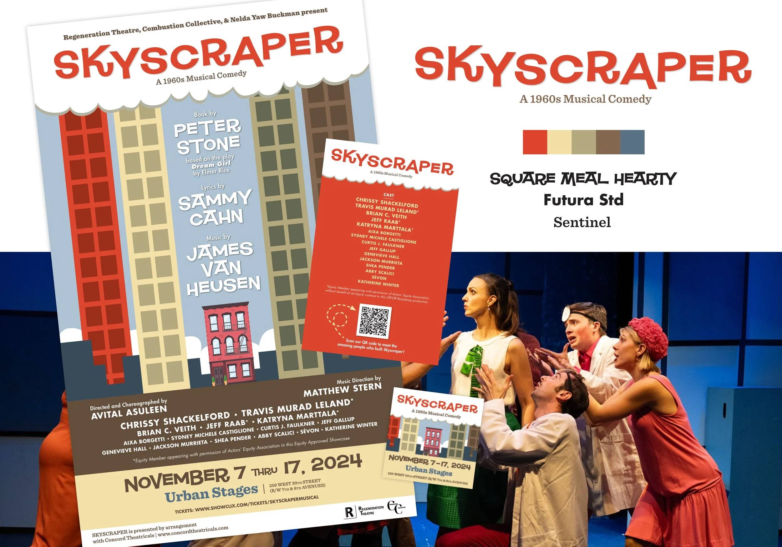 Skyscraper is a modern reimagining of a 1960s Broadway musical filled with romance, screwball comedy, and a unique take on urban life. The creative brief called for a playful, retro identity that honored the show’s vintage roots while inviting new audiences to rediscover it. I crafted a visual system inspired by mid-century poster design, paired with theatrical vibrancy and modern clarity.